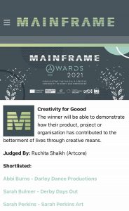 I’m super excited to announce that I have been shortlisted for an award by Derby Mainframe. I’m in the final 3 for the category of “ Creativity for good” Mainframe highlight the creative & digital communities in Derby & Derbyshire of which I am proud to be part of! I can’t wait for the awards…