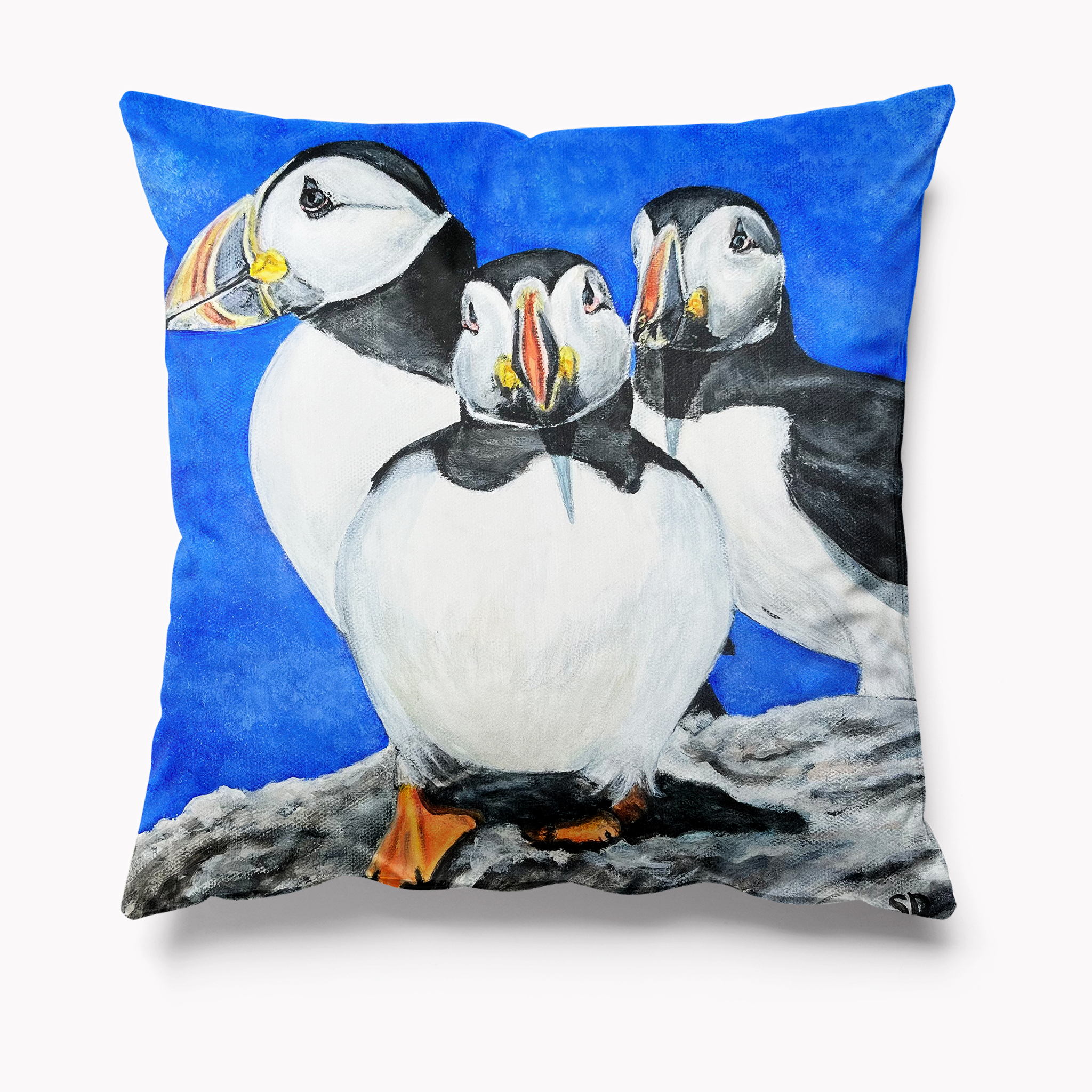 An Improbability Velvet cushion is of a trio of Puffins from my bird range of artworks
